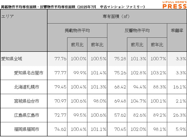 2025年7月の愛知県および地方4市(札幌市、仙台市、広島市、福岡市)のファミリー向き中古マンションの掲載物件平均専有面積および反響物件平均専有面積は以下の通り。