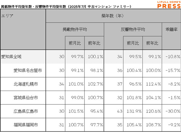 2025年7月の愛知県および地方4市(札幌市、仙台市、広島市、福岡市)のファミリー向き中古マンションの掲載物件平均築年数および反響物件平均築年数は以下の通り。
