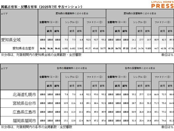 2025年7月の愛知県および地方4市(札幌市・仙台市・広島市・福岡市)中古マンション市場における、各エリアの掲載占有率および反響占有率は以下の通り。