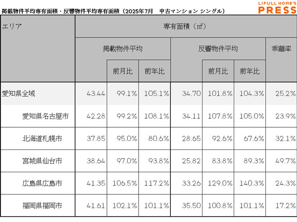 2025年7月の愛知県および地方4市(札幌市、仙台市、広島市、福岡市)のシングル向き中古マンションの掲載物件平均専有面積および反響物件平均専有面積は以下の通り。