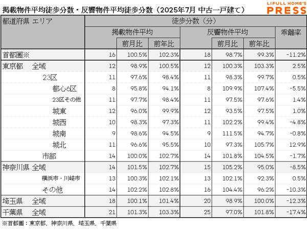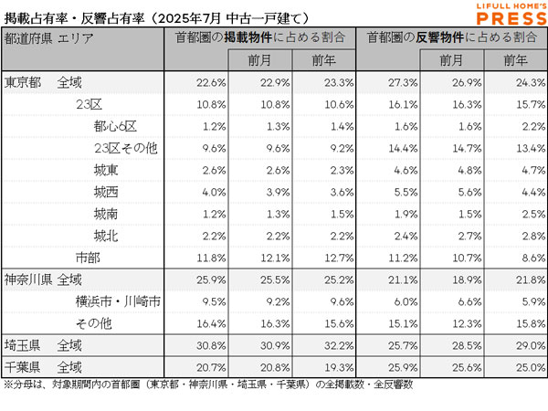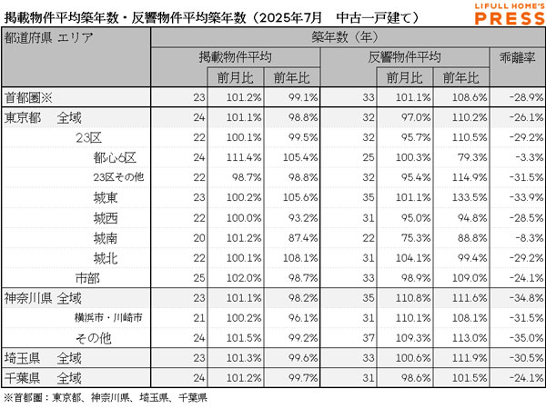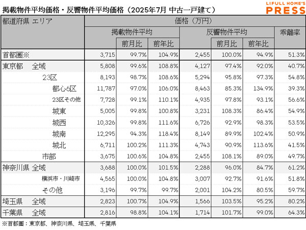 2025年7月の首都圏中古一戸建ての掲載物件平均価格および反響物件平均価格は以下の通り。