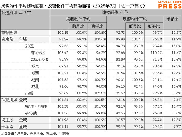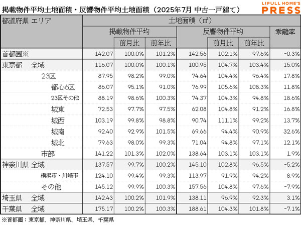2025年7月の首都圏中古一戸建ての中古一戸建ての掲載物件土地建物面積および反響物件平均土地面積は以下の通り。