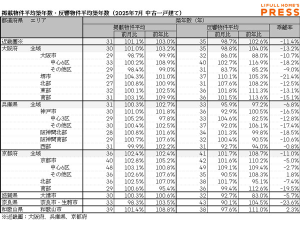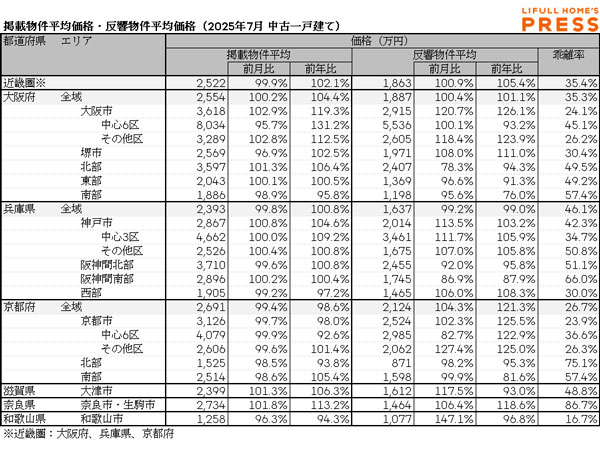 2025年7月の近畿圏中古一戸建ての掲載物件平均価格および反響物件平均価格は以下の通り。