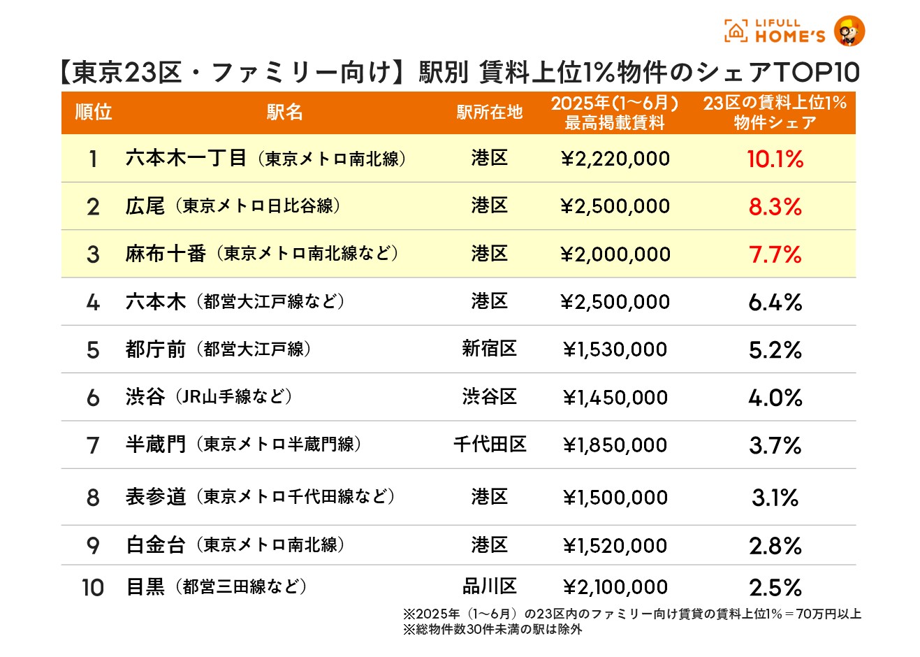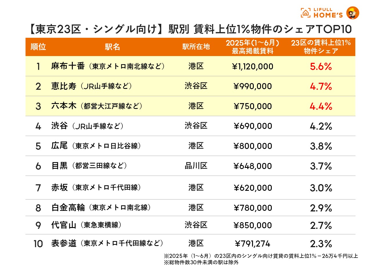 最寄り駅別の、全物件に占める賃料上位1%の物件の割合は、シングル向け物件の最大が「麻布十番」(5.6%)、ファミリー向け物件の最大が「六本木一丁目」(10.1%)となった。なお、2025年に掲載された賃貸物件のうち、シングル向きの最高賃料は麻布十番駅の賃料112万円の物件であった。