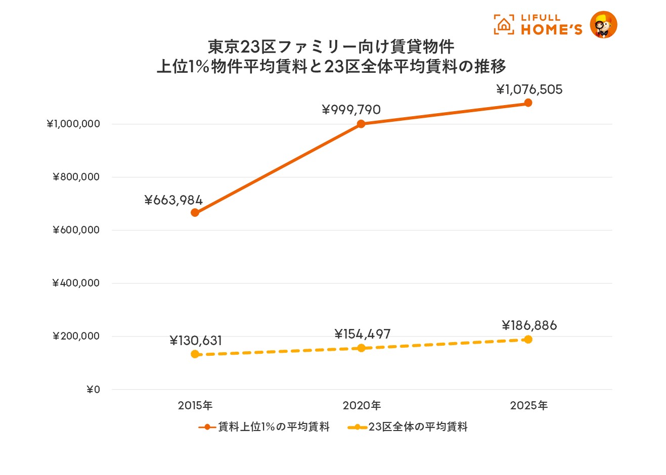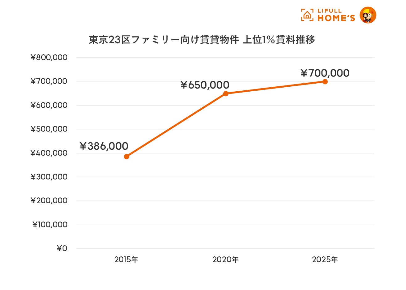 東京23区シングル向け物件の賃料上位1%の金額は、2015年の19万9,000円から2025年には26万4,000円となり、10年で約1.3倍に。また、ファミリー向け物件では、2015年の38万6,000円から2025年には70万円と約1.8倍にまで上昇していることがわかった。