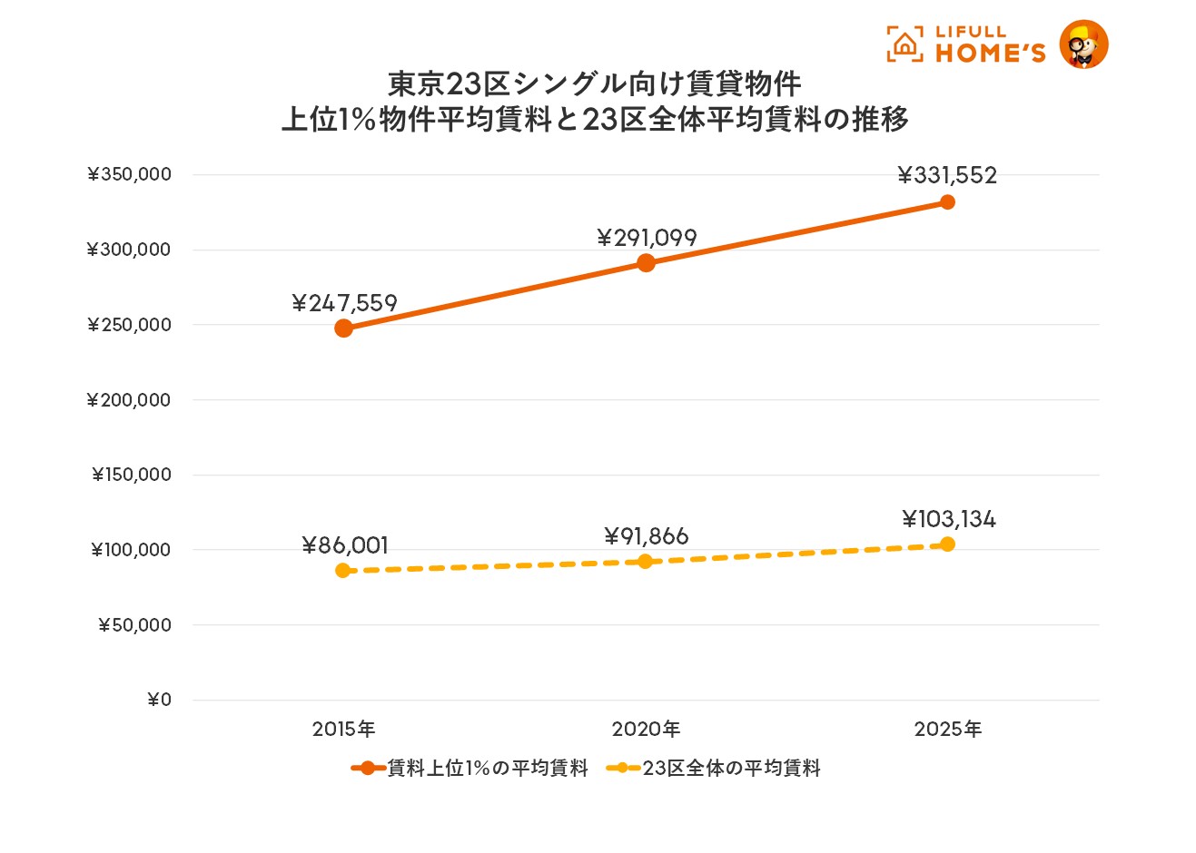 東京23区シングル向き物件のうち、賃料上位1%の物件の平均賃料は全物件の平均賃料の約3.2倍、ファミリー向け物件では約5.8倍となった。10年前(2015年)の時点ではシングル向け物件で約2.8倍、ファミリー向け物件で約5.1倍であったことから、東京23区では高級賃貸物件とその他の物件の間で賃料水準の差が広がっていることがうかがえる。
