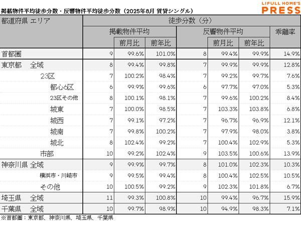 2025年8月の首都圏シングル向き賃貸物件の掲載物件平均徒歩分数および反響物件平均徒歩分数は以下の通り。