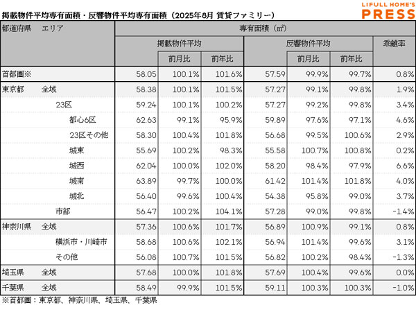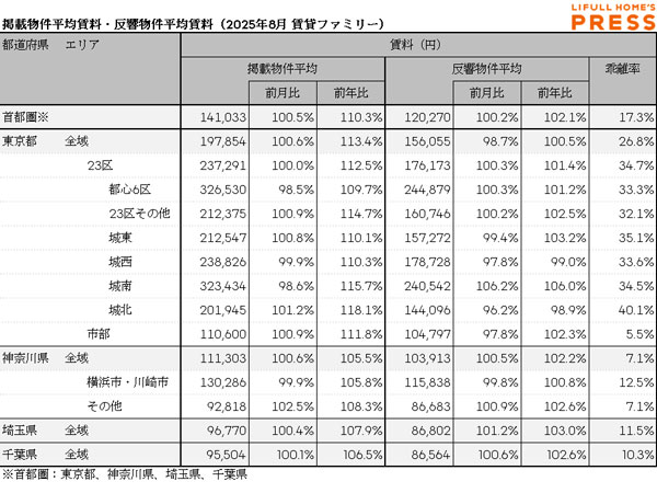 2025年8月の首都圏ファミリー向き賃貸物件の掲載物件平均賃料および反響物件平均賃料は以下の通り。