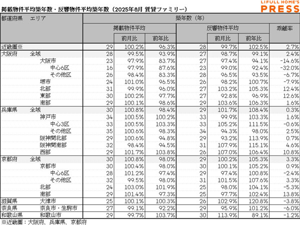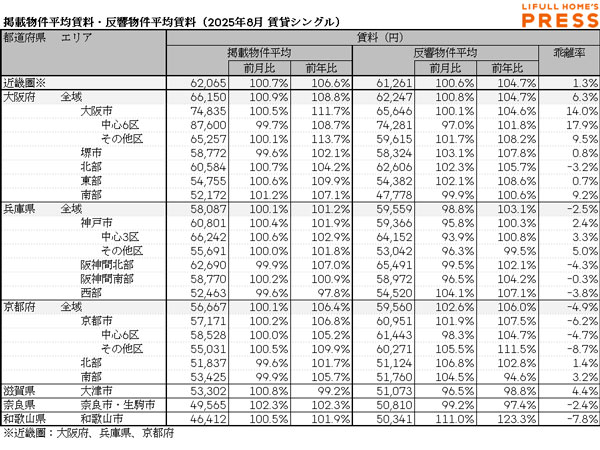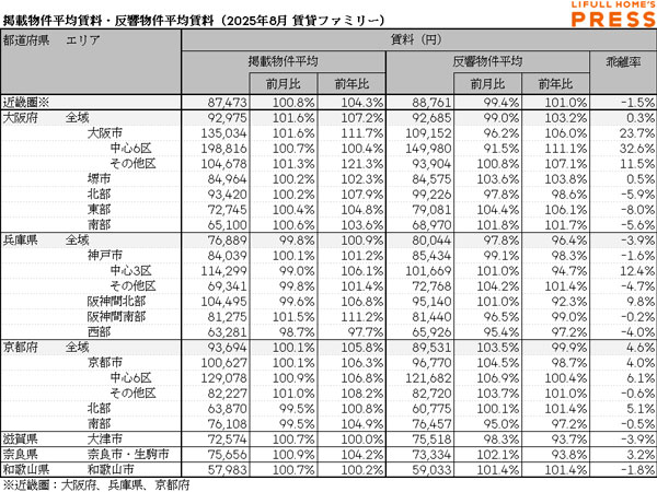 2025年8月の近畿圏ファミリー向き賃貸物件の掲載物件平均賃料および反響物件平均賃料は以下の通り。