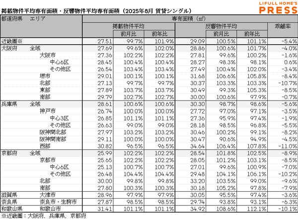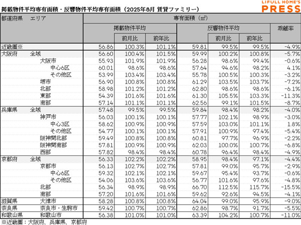2025年8月の近畿圏ファミリー向き賃貸物件の掲載物件平均専有面積および反響物件平均専有面積は以下の通り。