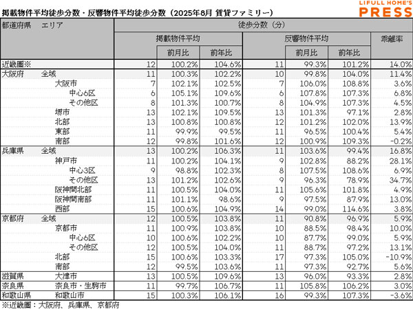 2025年8月の近畿圏ファミリー向き賃貸物件の掲載物件平均徒歩分数および反響物件平均徒歩分数は以下の通り。