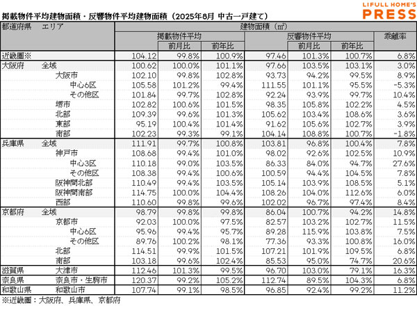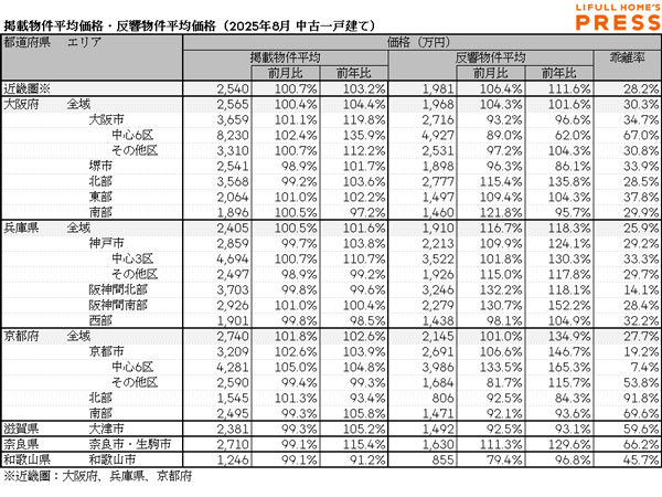 2025年8月の近畿圏中古一戸建ての掲載物件平均価格および反響物件平均価格は以下の通り。
