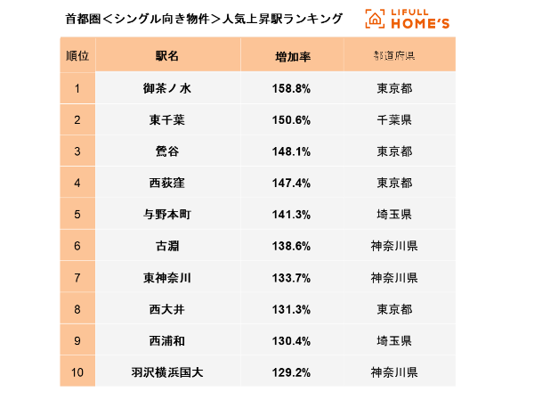 首都圏<シングル向き物件>人気上昇駅ランキングTOP10
