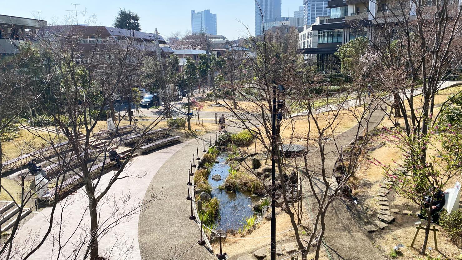 目黒駅周辺は一見緑が少ないように思うかもしれませんが、実は隠れた癒しスポットがいくつかあります。遊具やアスレチックが充実した子どもが遊べる公園、というよりは、芝生や樹々に囲まれた場所にベンチが設置された、散歩や休憩に適した場所が多いという特徴があります。