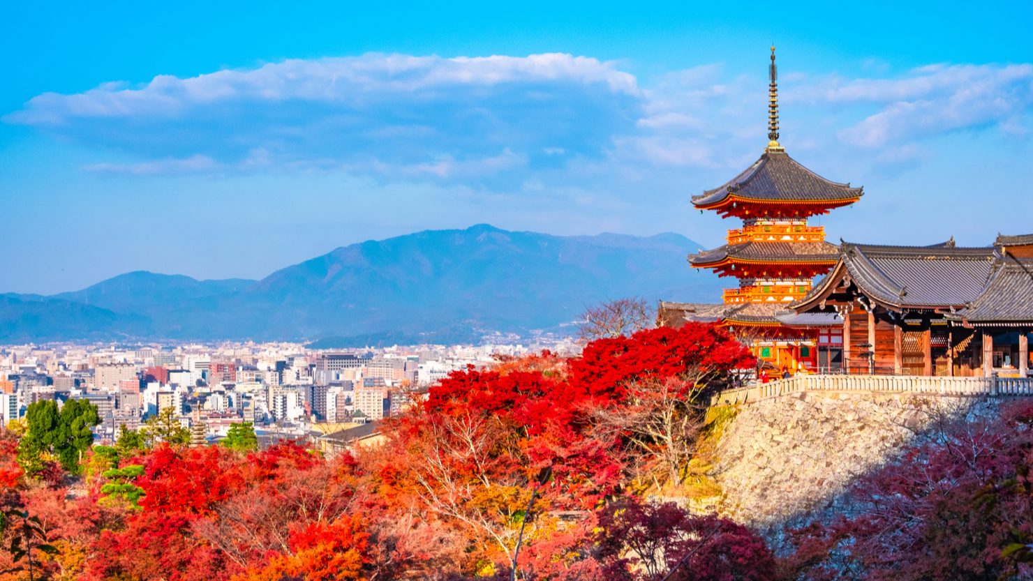 京都駅から徒歩15分の世界遺産の寺院「東寺」は、春の桜や秋の紅葉と一緒に五重塔がライトアップされていて、美しい景色を眺められます。毎月21日の「弘法市」も楽しいです。