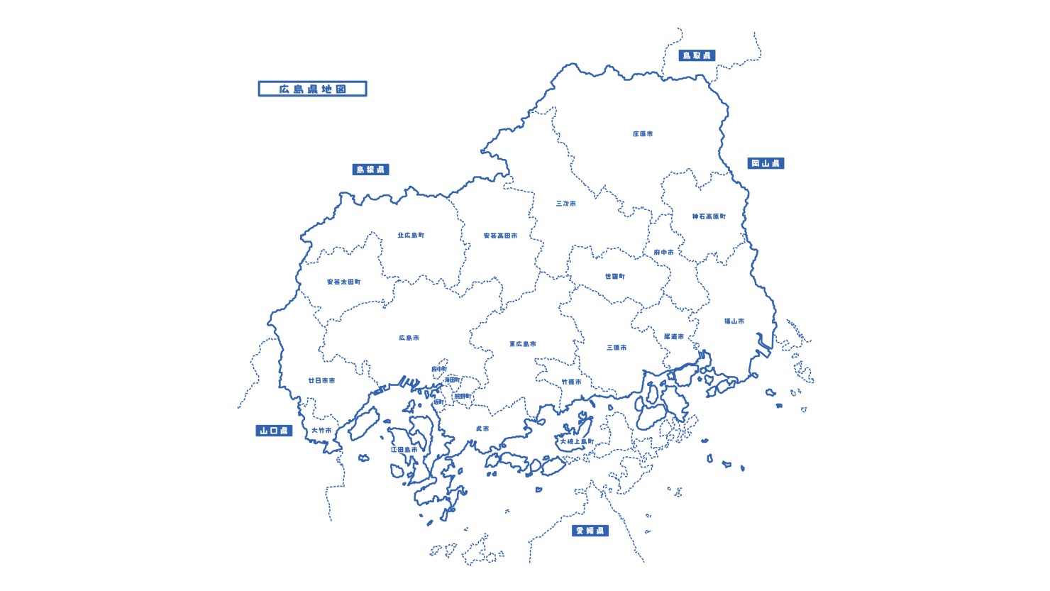 広島県の東部は岡山県、北東部は鳥取県、北部は島根県、西部は山口県に接しており、広島県以外のすべての中国地方の県と隣接しているのが特徴です。また南部は瀬戸内海を隔てて愛媛県と、南東部は同じく瀬戸内海を隔てて香川県とも接しています。