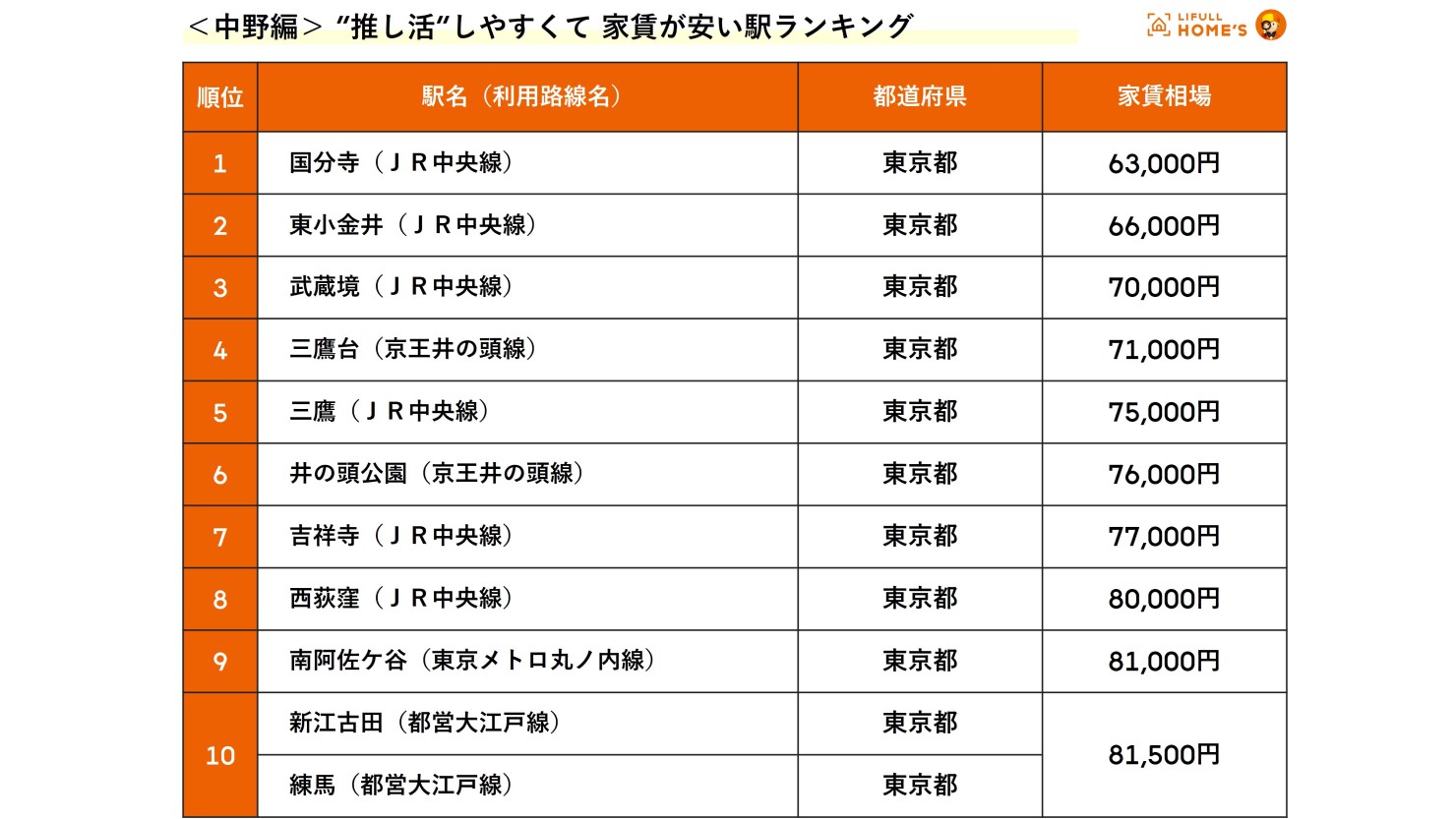 1位は「国分寺駅」(63,000円)がランクイン。JR中央線を通じて乗り換えなしで中野にアクセスすることができます。同じくJR中央線沿線の駅からは2位「東小金井駅」(66,000円)、3位「武蔵境駅」(70,000円)、5位「三鷹駅」、7位「吉祥寺駅」(77,000円)、8位「西荻窪駅」(80,000円)がランクインしました。