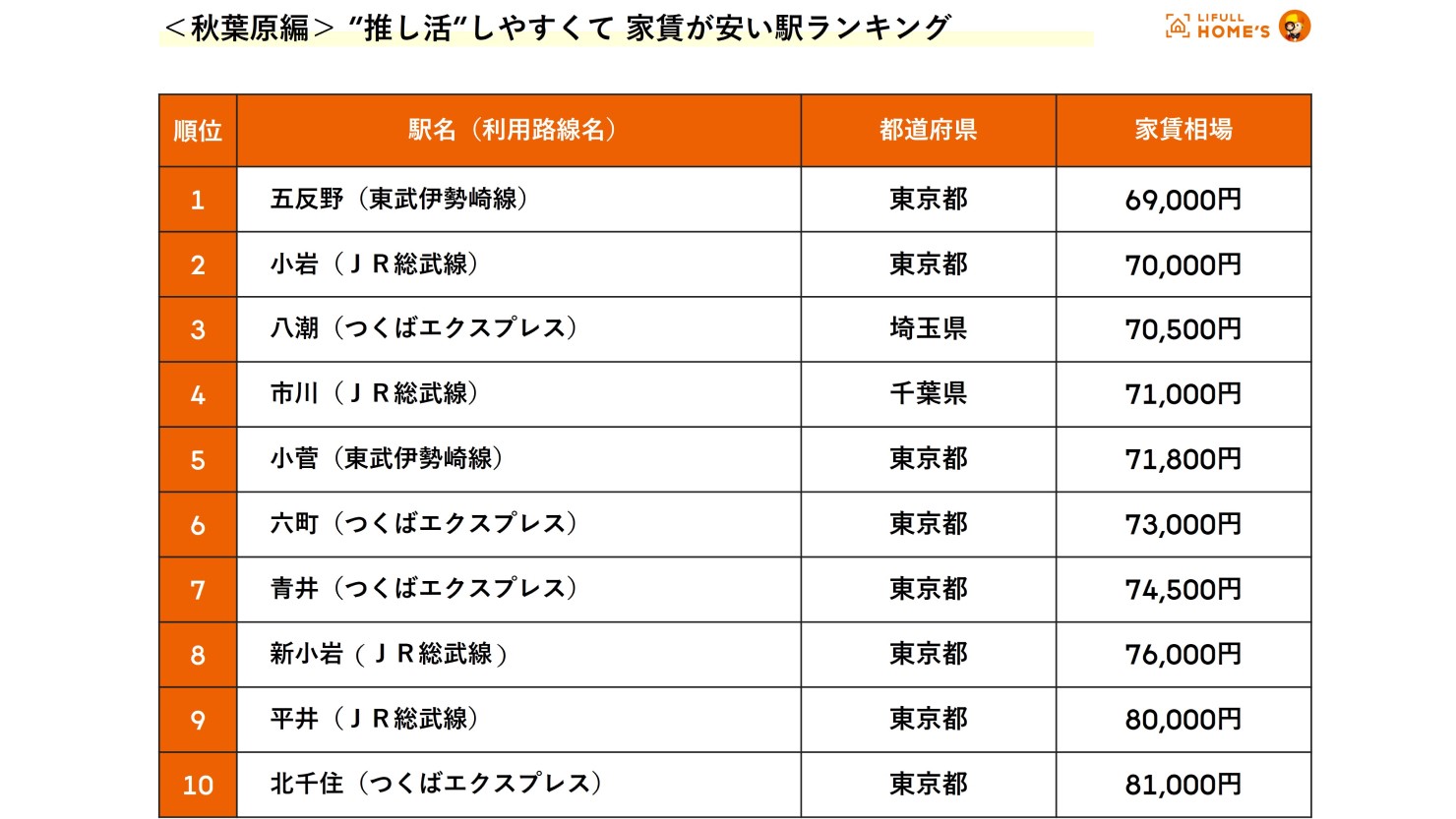 今回上位にランクインした駅は、家賃を抑えて推し活を楽しみつつ、生活利便性も高く暮らしやすい駅といえるでしょう。