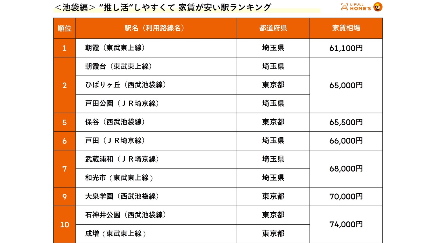 池袋編でランクインした駅は、東武東上線、西武池袋線、JR埼京線沿線で構成されており、埼玉県に位置する駅も多いのが特徴です。また、秋葉原編・中野編と比較すると家賃相場が6万円台の駅が上位を占めました。