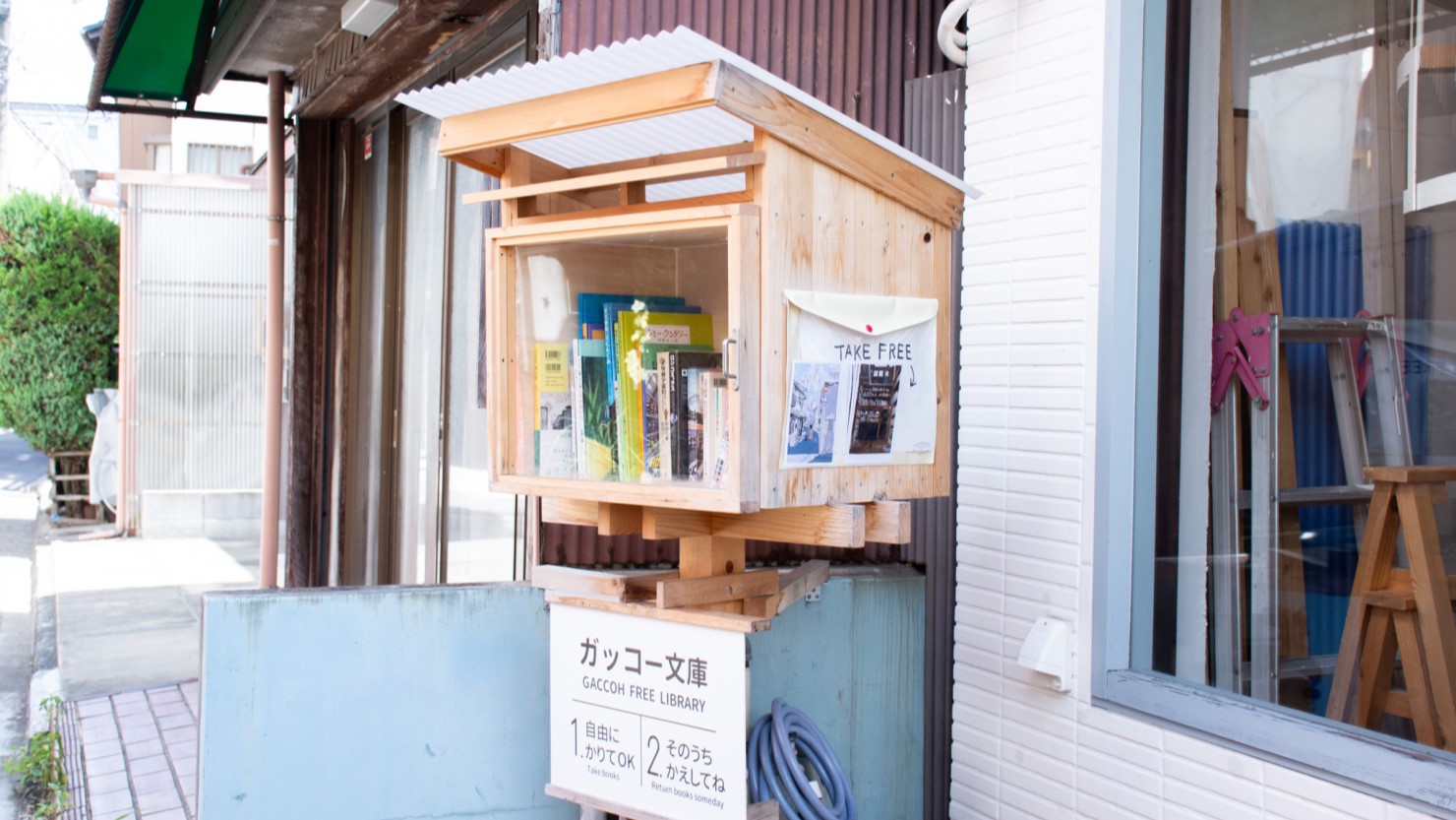 太田さん:「そうとも言えるかもしれません。そんな狙いもあって始めたのが入り口前の本棚『ガッコー文庫』です。コロナ禍で講義も開催できず、うちに人が寄り付かなくなってしまった状況に危機感を覚えて、という理由もあるんですけど(笑)。シェアハウスの住人が置いていった蔵書や僕が買った漫画なんかを入れて、いつ返してもいいというシステムでほったらかしています。実際、子どもから大人までいろんな人が足をとめてくれて予想以上にたくさんの方に利用されていますよ」