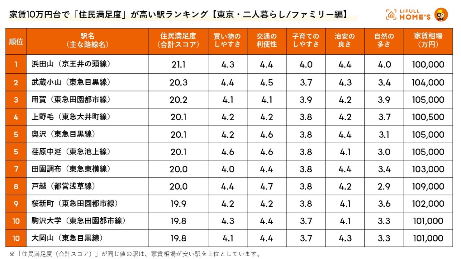 家賃10万円台で「住民満足度」が高い駅ランキング(東京・二人暮らしファミリー編)