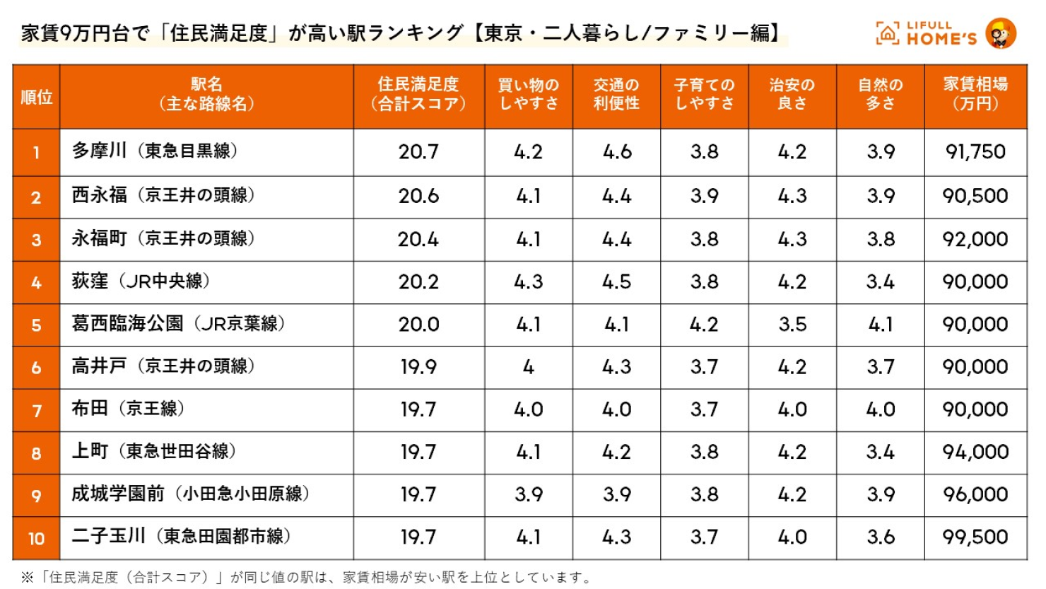 家賃9万円台で「住民満足度」が高い東京の駅ランキング(二人暮らし・ファミリー編)
