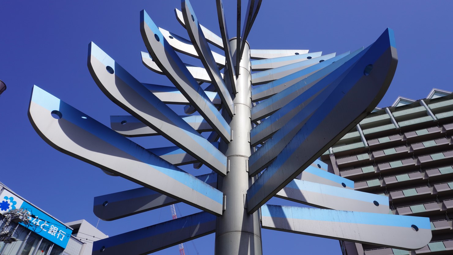 まず向かったのは俗称「いかなご広場」。神戸の名産として知られる「いかなごのくぎ煮」ですが、ここ垂水を発祥の地とする説もあります。「でもですね!」と、早速堀さんからエクスキューズが。写真の象徴的なモニュメントは当然いかなごを模したものかと思いきや、いかなごというより魚一般をモチーフにした防風設備なんだそうです。