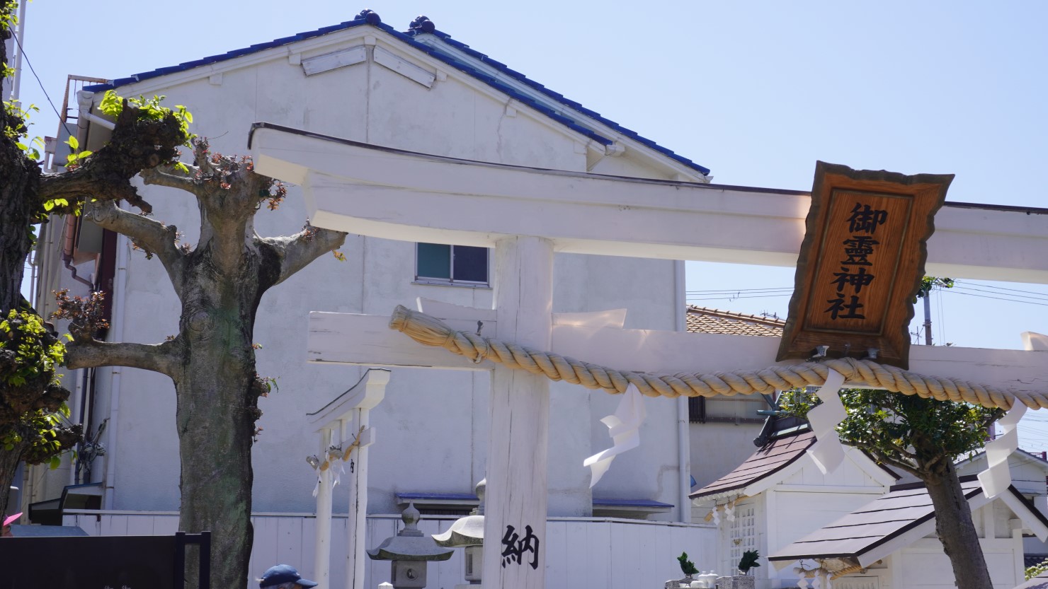 さわやかな白い鳥居と、それにそぐわないおどろおどろしい「御霊」の字。源平合戦で両軍とも多くの死者を出した垂水の福田川。その霊を祀るために作られた神社です。一度は別の場所に移されるも地域住民の働きかけでこちらに戻ってきた経緯があるそうで、一帯の御霊町という地名はこの神社に由来します。