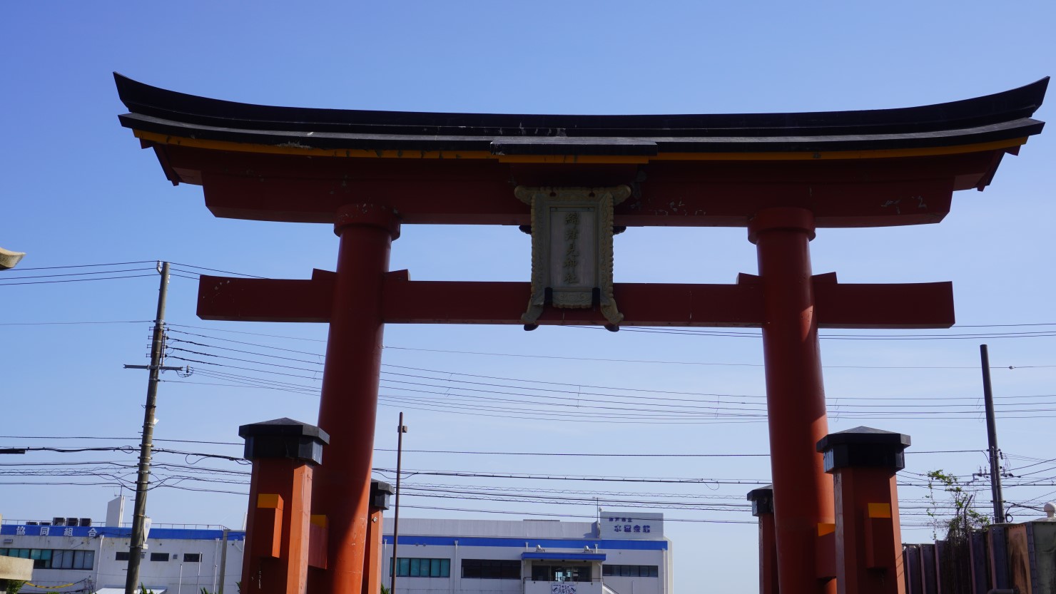 海のほうに行けば、言わずと知れた「海神社」(かい / わたつみじんじゃ) も。航海安全、漁業繁栄、交通安全、安産、開運厄除けの神様として有名です。が、ご覧の通り、立派な鳥居はマンションに挟まれる形に……。もともとは朱色ではなく、周囲に建物が建ち始めて目立たなくなったことから色を塗った経緯があります。ところが……、