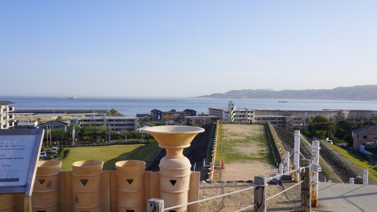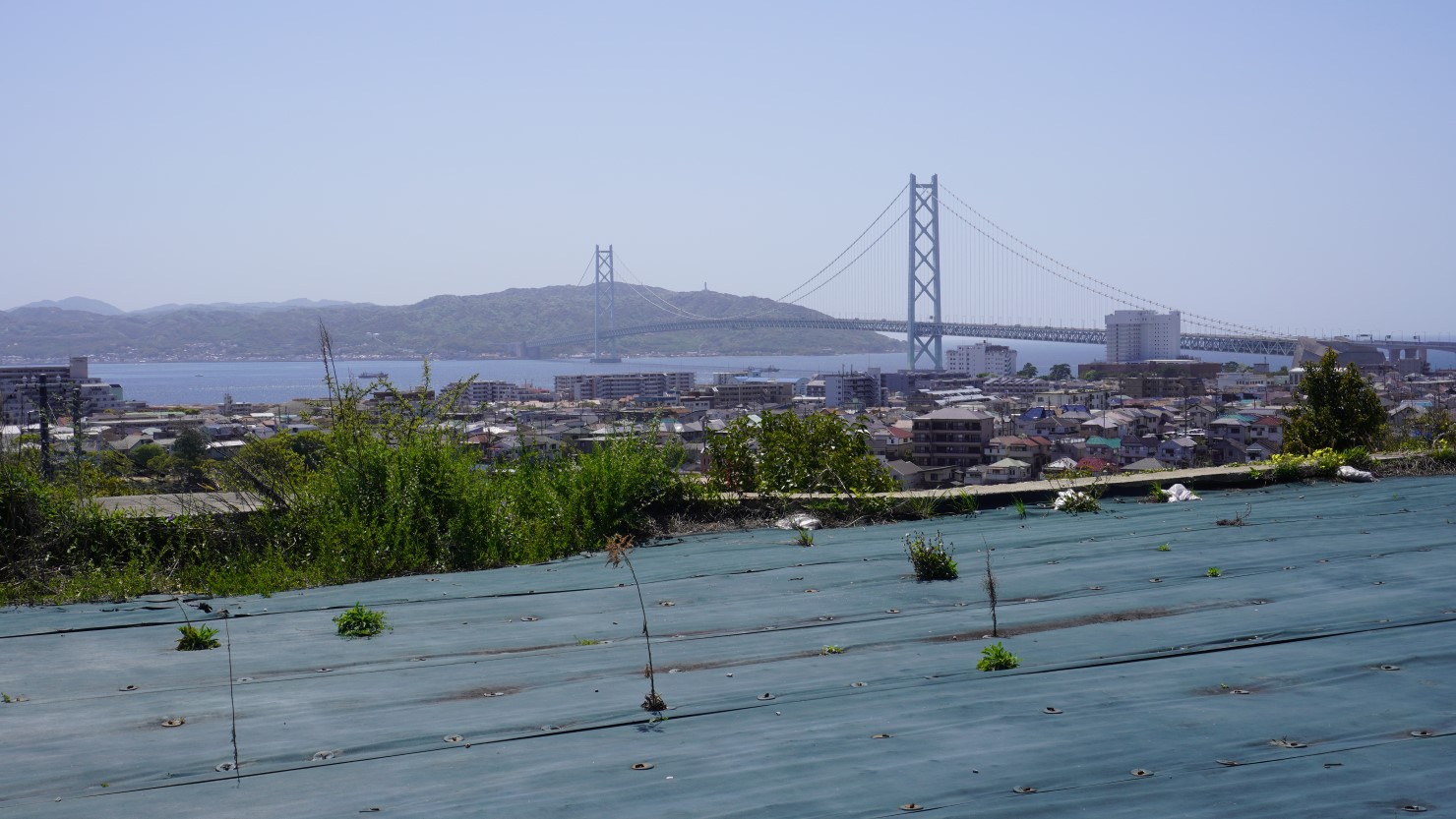 坂を登り切ってから少し横道に逸れると、オーシャンビューが。もともとは市外住宅が多く、ここまでの景色は見えなかったといいます。取り壊された結果、明石海峡大橋を望む絶景スポットに。