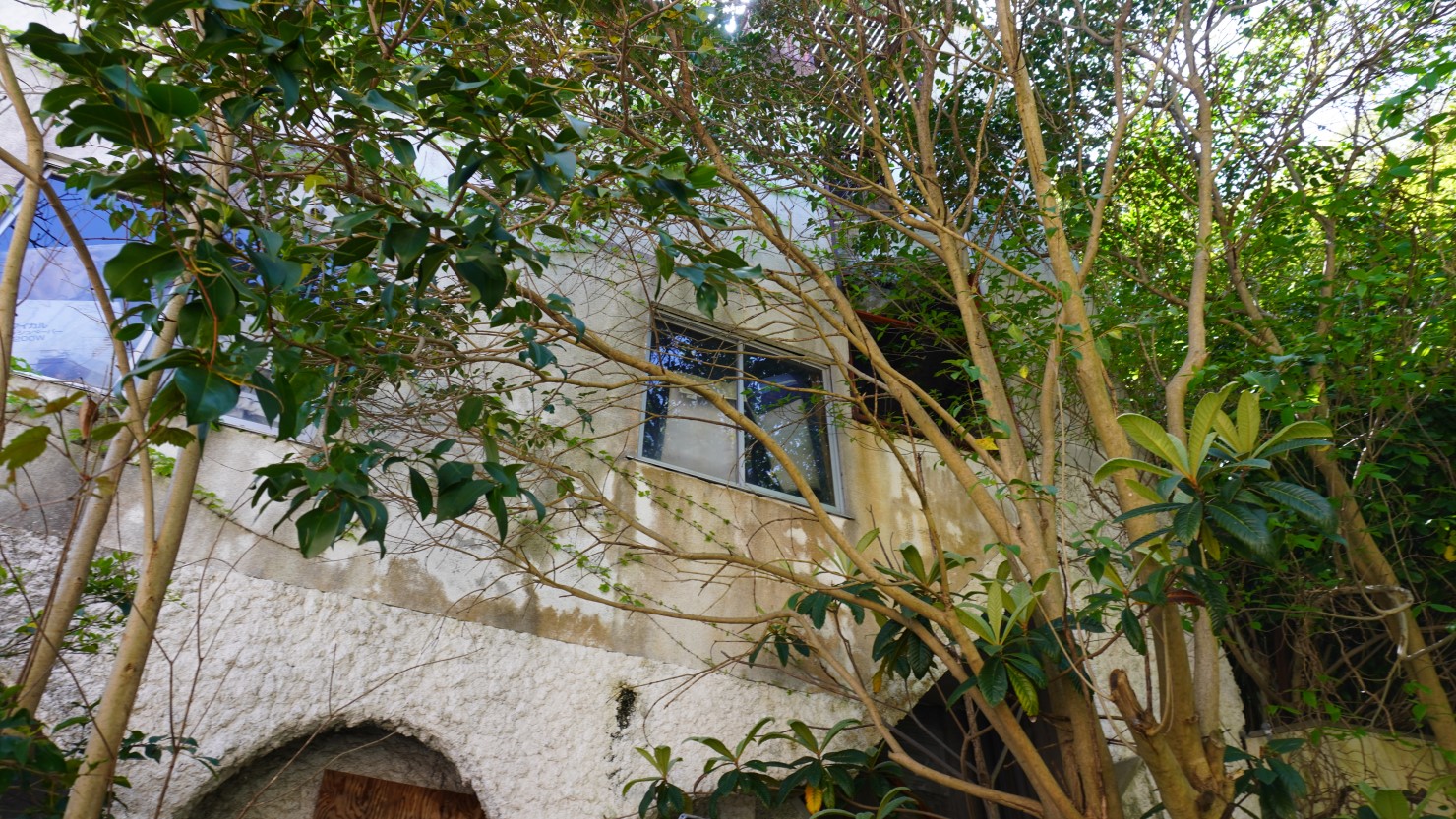 趣のある建物に遭遇しました。退色した白い壁、ゴツゴツとしたテクスチャー、1階のアーチ、繁茂する木々に囲まれた環境が、どこか外国の海沿いの町に来たかのように錯覚させます。