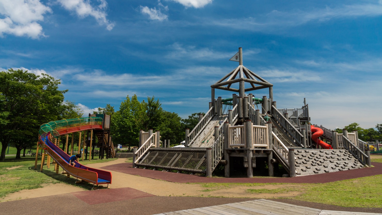 遊具やスポーツ、BBQなど、多様な楽しみ方ができる広大な公園です。特に遊具や水遊び場が豊富で、子どもがいる家庭には大人気。アスレチックやふわふわドームなど、エリアによって異なる遊具で遊べるので、子どもたちも飽きずに1日過ごせますよ。