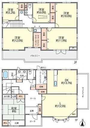 - 6LDK ( ダイニングキッチン 13.7帖(1階) リビング 13.5帖(1階) 和室 8畳(1階) 洋室 12帖(2階) 洋室 11.9帖(2階) 洋室 10帖(2階) 洋室 6帖(2階) 洋室 5.2帖(2階) )