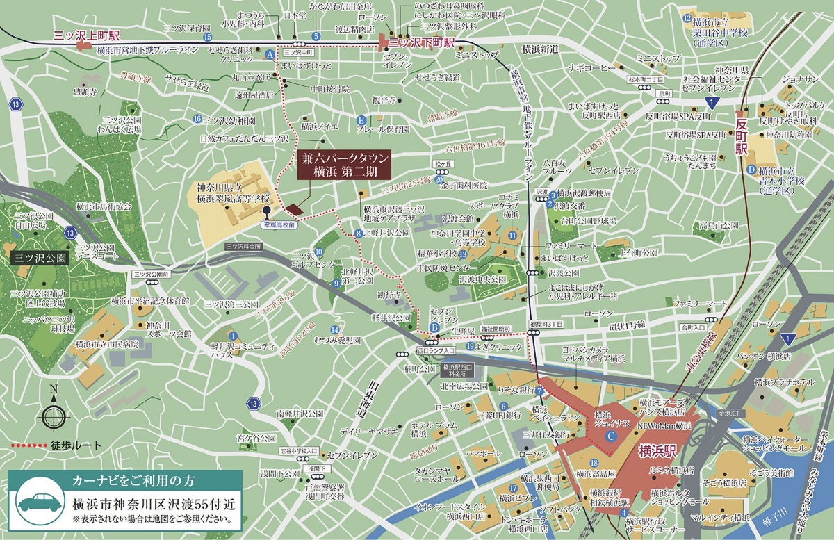 JR東海道本線「横浜」駅 徒歩17分~18分 横浜市営地下鉄ブルーライン「三ツ沢下町」駅 徒歩10分~11分 |
