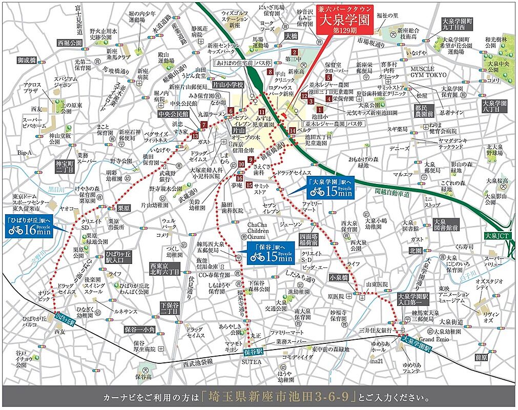 - ※物件から周辺のお店・施設までの距離は、利用が想定される道路を通行した場合の距離です。なお、必ずしも最短距離を保証するものではありません。