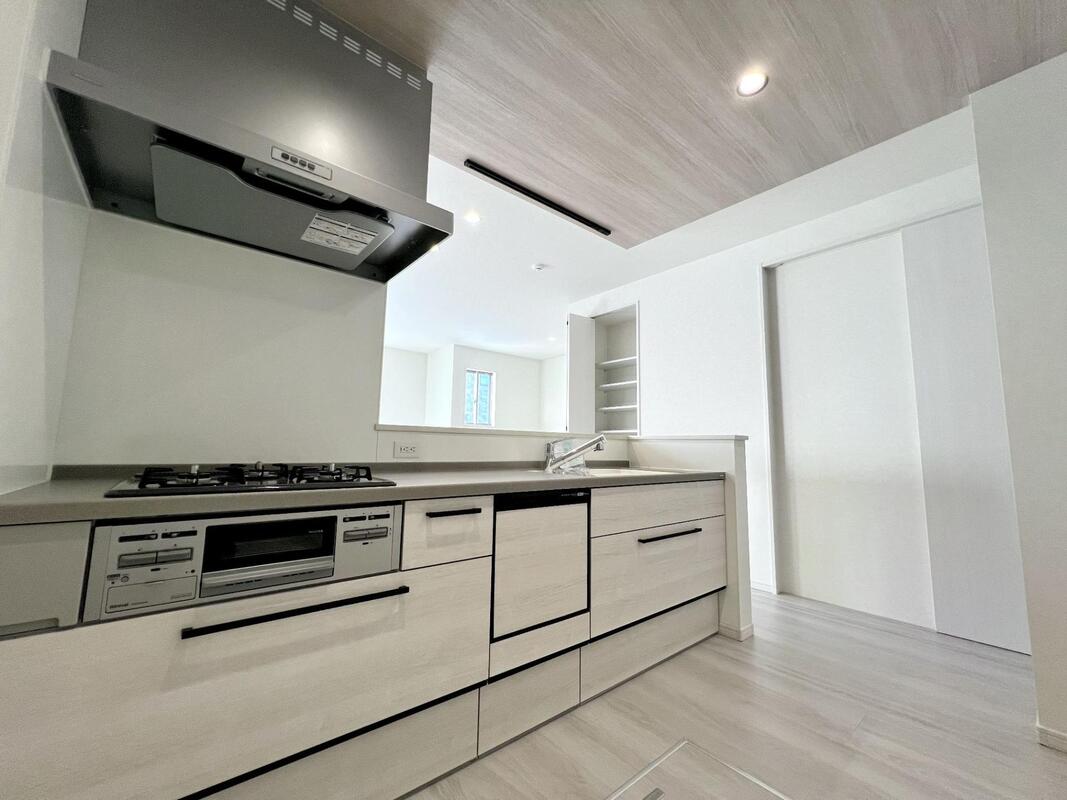 食器洗い乾燥機や3口コンロを備え、家事や...