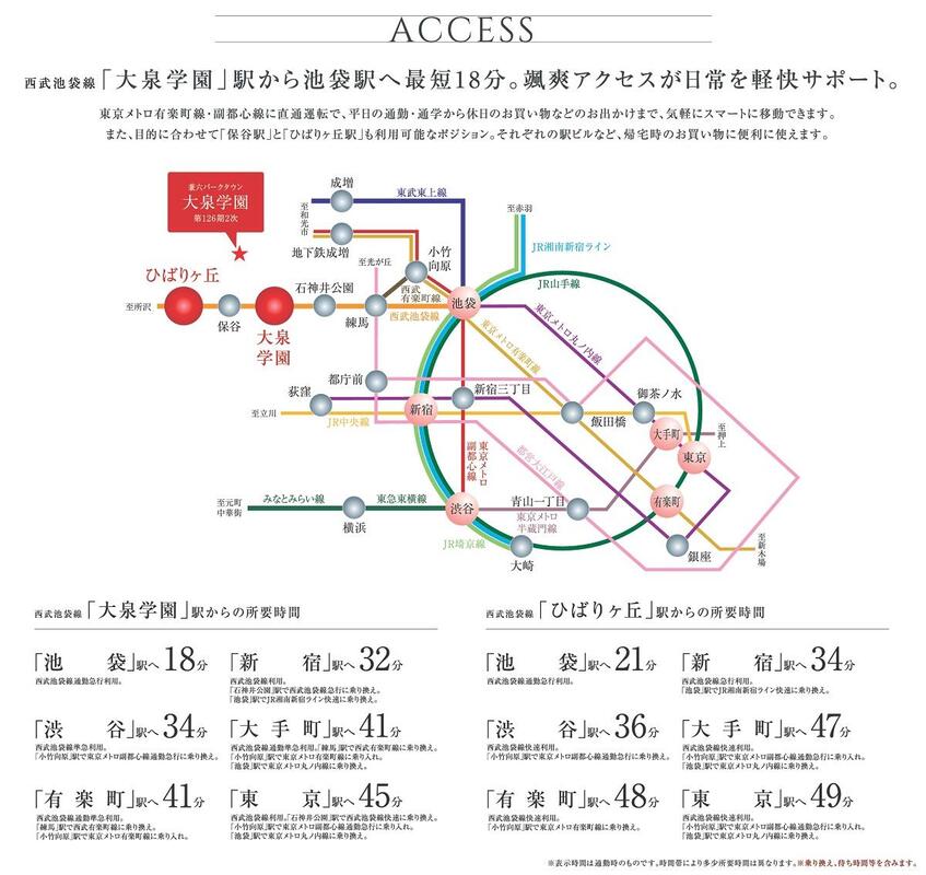・西武池袋線「大泉学園」駅から池袋駅へ最短18分。他路線への乗り入れで広域移動も便利。・「保谷」駅、「ひばりヶ丘」駅も利用でき、駅前には多彩な店舗が揃う商業施設も!