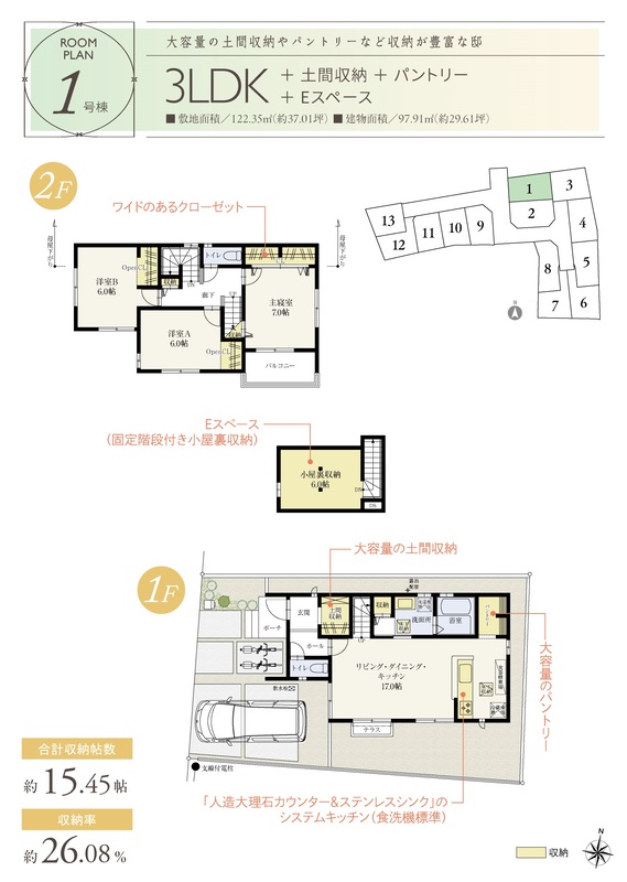 1号棟 間取り 3LDK 価格 4459万円 建物面積 97.91m2 土地面積 122.35m2 -
