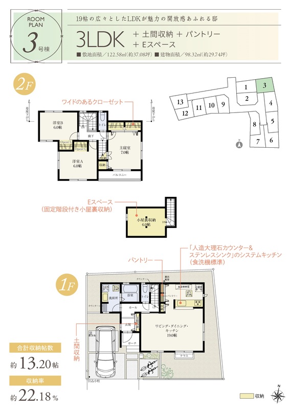 3号棟 間取り 3LDK 価格 4261万円 建物面積 98.32m2 土地面積 122.58m2 -