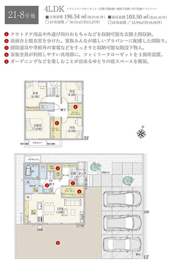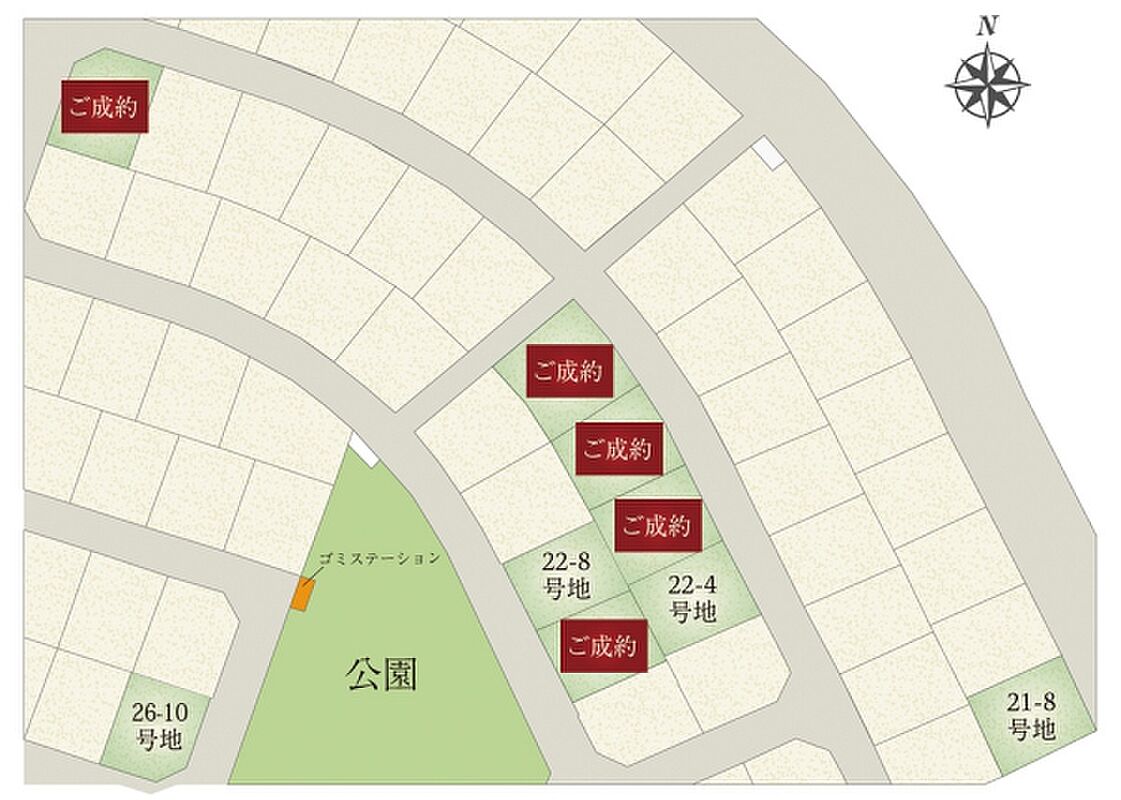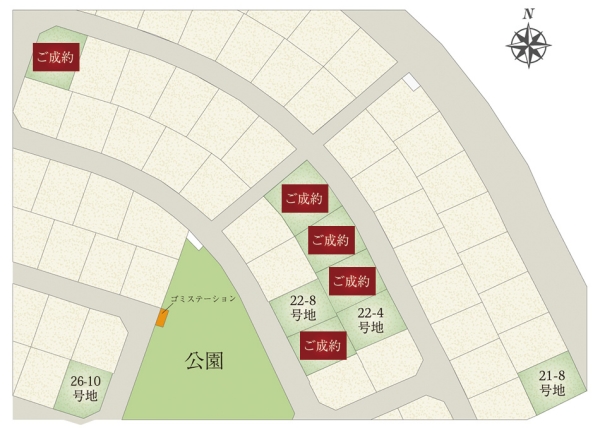 - 196.54m2(21-8号地)、197.63m2(22-4号地)、186.47m2(22-8号地)、178.24m2(26-10号地) 私道負担なし