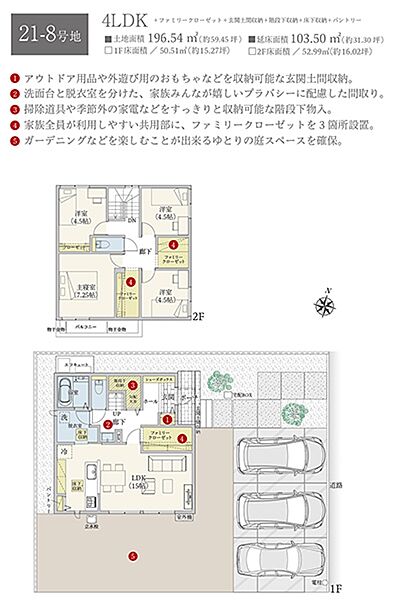 | 建物面積 | 103.50m2(21-8号地)、76.01m2(22-4号地)、81.97m2(22-8号地)、84.00m2(26-10号地) | 土地面積 | 196.54m2(21-8号地)、197.63m2(22-4号地)、186.47m2(22-8号地)、178.24m2(26-10号地) 私道負担なし |
