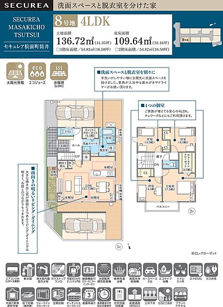 | 建物面積 | 109.64m2(8号地) | 土地面積 | 136.72m2(8号地) 私道負担なし |