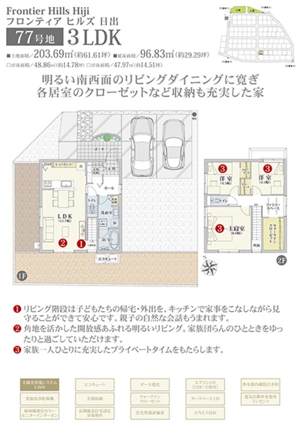 | 建物面積 | 96.83m2(77号地) | 土地面積 | 203.69m2(77号地) 私道負担なし |