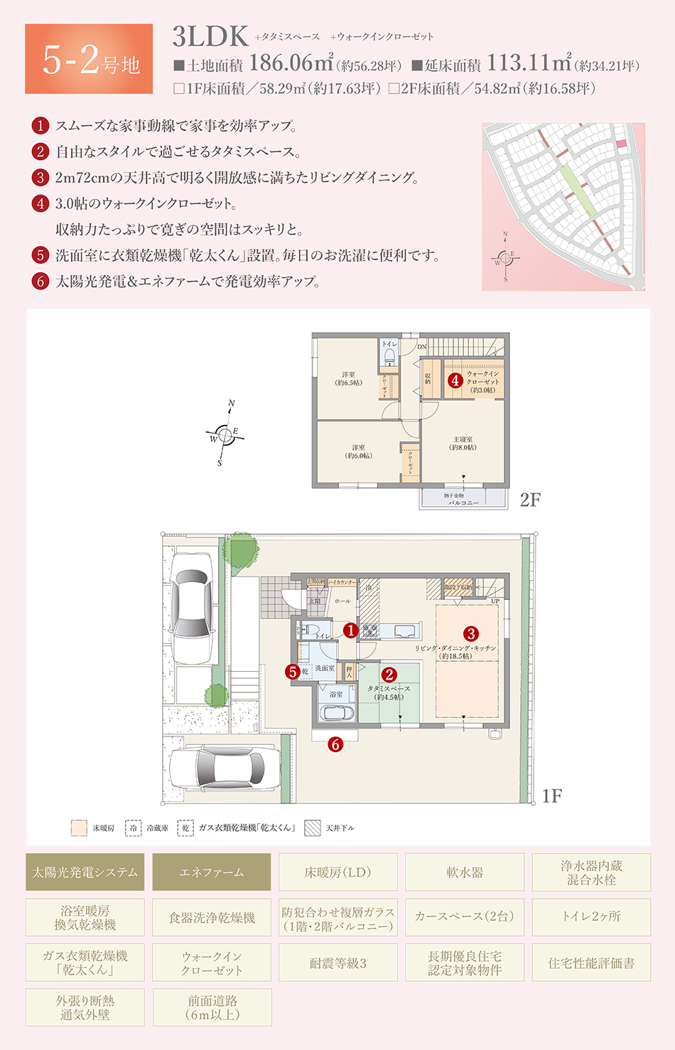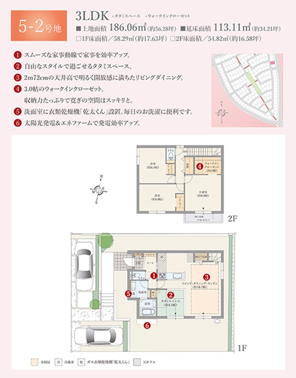 | 建物面積 | 113.11m2(5-2号地)、111.46m2(5-3号地)、113.28m2(6-9号地)、102.02m2(6-21号地) | 土地面積 | 186.06m2(5-2号地)、185.98m2(5-3号地)、178.10m2(6-9号地)、179.96m2(6-21号地) 私道負担なし |