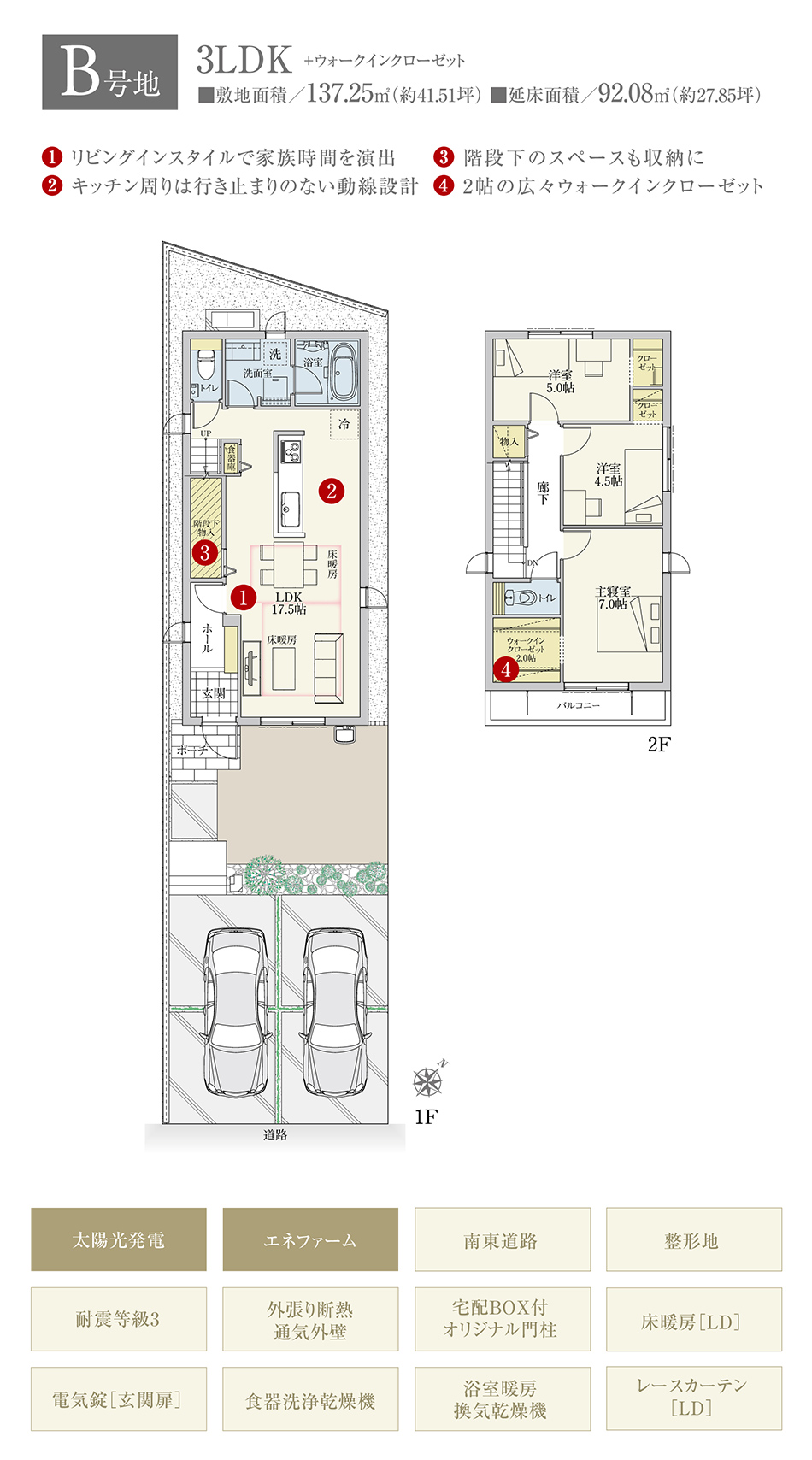 | 建物面積 | 96.38m2(A号地)、92.08m2(B号地) | 土地面積 | 150.17m2(A号地)、137.25m2(B号地) 全て私道負担なし |