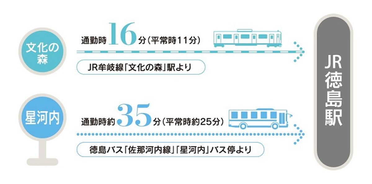 JR牟岐線「文化の森」駅 徒歩52分 JR高徳線「徳島」駅 徒歩92分 |