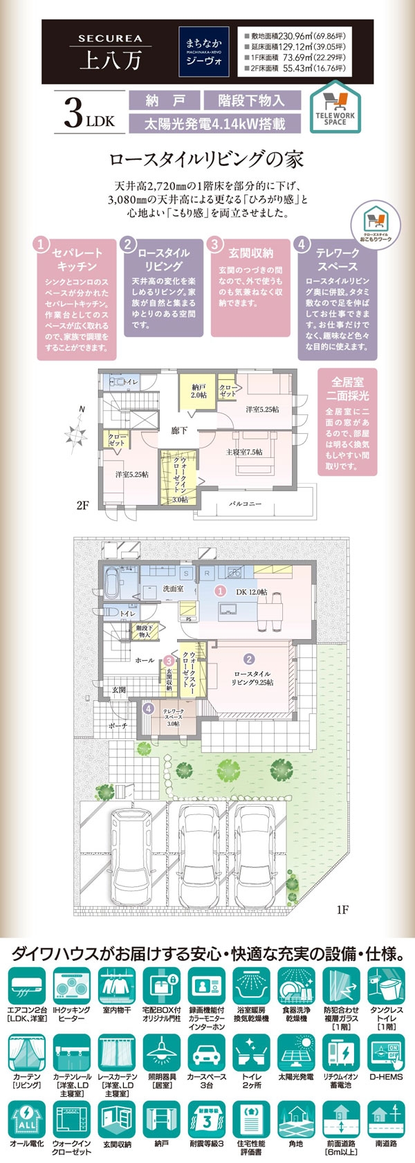 | 建物面積 | 129.12m2(21号地) | 土地面積 | 230.96m2(21号地) 私道負担なし |