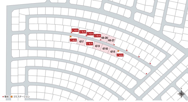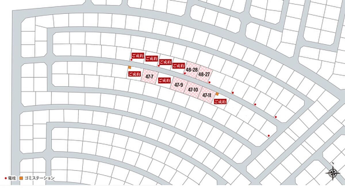 | 建物面積 | 92.50m2(47-9号地)~147.00m2(47-7号地) | 土地面積 | 239.37m2(48-28号地)~244.61m2(47-9号地) 全て私道負担なし |