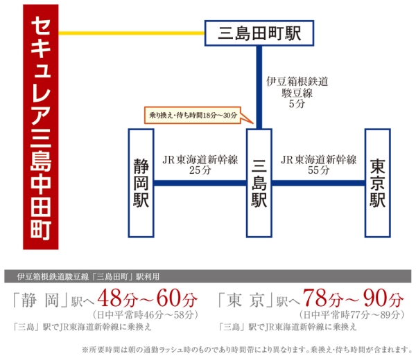 伊豆箱根鉄道駿豆線「三島田町」駅 徒歩5分~6分 JR東海道新幹線「三島」駅 徒歩21分~21分 |