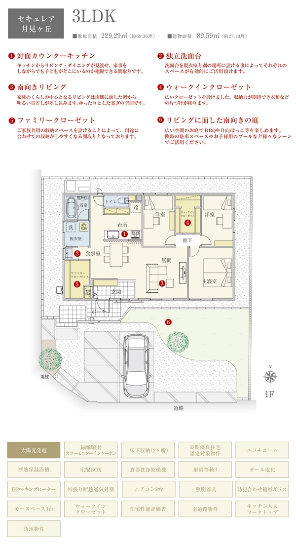 | 建物面積 | 89.59m2(1号地) | 土地面積 | 229.29m2(1号地) 私道負担なし |